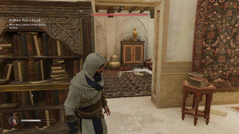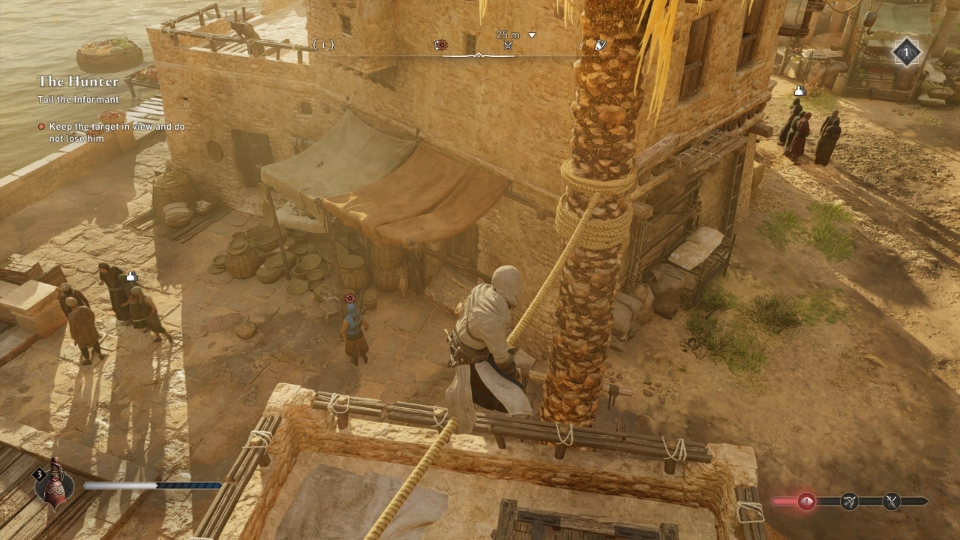 Dennoch wirkt es so zu Beginn so, als hätte die Chefetage sich mein Fazit von Valhalla zu Herzen genommen und würde wieder auf alte Tugenden setzen. Denn im Loop angekommen, macht Mirage durchaus Spaß. Wie früher haben wir wieder Zielpersonen, über die wir nach und nach neue Informationen sammeln und uns so durch das Geflecht der Ordensmitglieder meucheln, bis wir das Oberhaupt finden. Dabei ist die Reihenfolge nicht vorgegeben, uns stehen nach der Ankunft in Bagdad alle Bereiche der Stadt und Außenwelt offen. Wer also, wie ich, erst einmal die ganze Karte aufdecken und alle Collectibles finden möchte, kann das genau so tun, wie diejenigen, die mit Scheuklappen stur der Geschichte folgen.