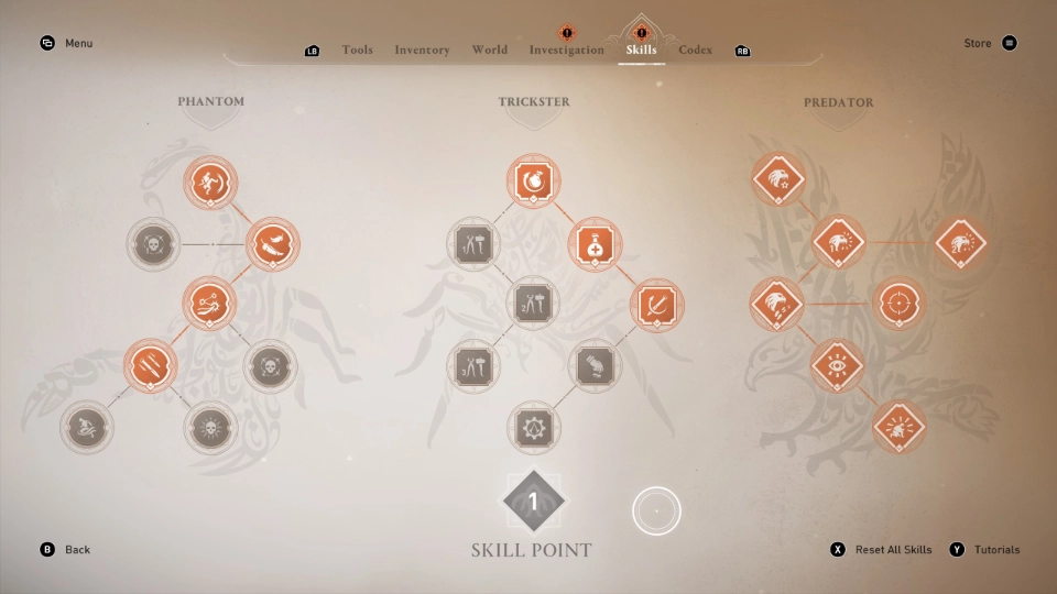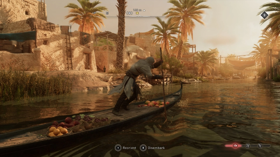 Anders als bei den anderen Vorgängern bestraft Mirage diesen Entdeckungsdrang nicht, sondern lädt uns geradezu ein, uns umzusehen. So decken die serientypischen Aussichtspunkte nicht mehr alle Schätze auf der Karte auf, sondern geben uns nur Marker, die wir abklappern können oder im Vorbeilaufen entdecken. Darin finden wir unter anderem Materialien, die wir zum Verbessern unserer Ausrüstung brauchen. Die verschiedenen Waffen und Rüstungen sorgen zwar nicht direkt dafür, dass sich an unserem Schadensoutput etwas ändert, liefern indes jedoch unterschiedliche Boni wie das leisere Ausschalten von Wachen oder einen langsameren Anstieg unseres Fahndungslevels.