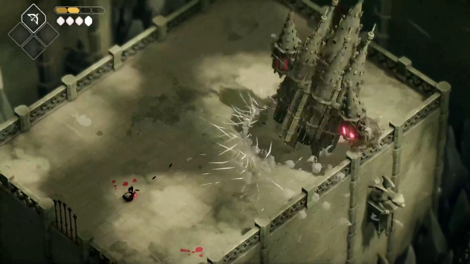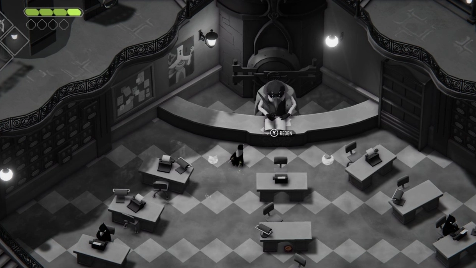 Death’s Door beginnt in einer schwarz-weißen, zerrissenen Welt vor dem Eingang zu einem Bürogebäude. Dort abgesetzt wurde unsere Spielfigur in Form einer Krähe. Einer wirklich niedlich guckenden Krähe mit einem rot leuchtenden Schwert, das im Monochrom deutlich hervorsticht (pun intended). Der Einstieg macht neugierig, der Artstyle ist ungewohnt und ansprechend. Wir betreten das Gebäude, wo wir auf andere fedrige Artverwandte treffen. Scheinbar sind wir Teil einer Behörde, und unser Job hat etwas mit dem Tod zu tun. Klar ist der Spieletitel schon ein echtes Givaway, aber da Krähen mythologisch ja gerne mal Gevatter Sensenmann begleitet, eine nachvollziehbare Erklärung.