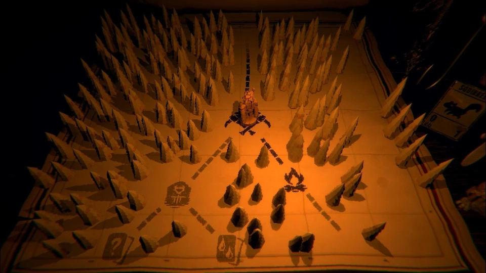 Wir erwachen in einem dunklen Raum. Das Einzige, was wir sehen, ist ein Holztisch. Es riecht förmlich nach Moder, nach abgestandener Luft. Wir blicken uns um: Nichts. Schwarz. Wir hören ein bedrohliches Brummen, fast schon Knacken. Aus der Dunkelheit uns gegenüber erwachen plötzlich zwei weiße Punkte – Augen. Der Anblick hilft nicht mit dem unguten Gefühl, das uns schon die ganze Zeit verfolgt. Mit einem Knarren beginnen die Augen mit uns zu sprechen und verwandeln sich in zwei orangene Spiralen. Das Ganze wirkt wie ein Verhör, aber nur die Augen sprechen. Eine verwitterte, knochige Hand erscheint im Lichtkegel – und dann spielen wir Karten.