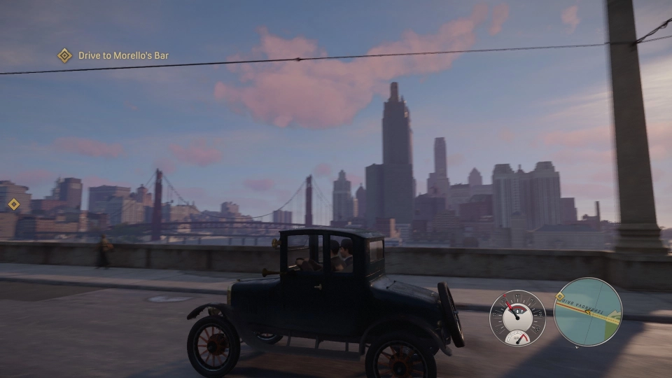 Ich könnte nun anfangen, dass ich mir tatsächlich mehr Sinnhaftigkeit für die Open World gewünscht hätte. Zu keinem Zeitpunkt gab es für mich die Notwendigkeit, die eigentlich sehr hübsche Kulisse von Lost Heaven genauer zu untersuchen oder die Wahrzeichen zu besichtigen. Im Original-Mafia brauchte man die zum Teil zur Orientierung, denn Minimaps mit Fahrrouten waren zu jener Zeit noch kein etabliertes Feature. Fans von damals werden sich vermutlich noch sehr genau an die Orts- und Straßennamen erinnern können, für mich flogen sie mit festem Blick auf die praktische Routenanzeige an meinem Sichtfeld vorbei. Aber ist das wirklich etwas Schlechtes, wenn es ohnehin nichts zu entdecken gibt?