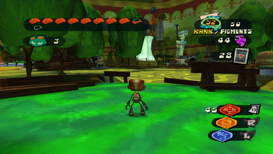 Diese Simplizität scheint mir ein erster Indikator, dass Psychonauts ein typischer, kindgerechter Plattformer mit komisch aussehenden Charakteren und überdrehter Action ist, der wohl kaum als Unterhaltung für Erwachsene dienen kann. Als Konsequenz bin ich bereits nach den ersten Minuten Gameplay eigentlich schon bereit, das Spiel wieder zu deinstallieren. Aus dem Intro in der Spielwelt starten wir im ersten Areal des Campgeländes. Die Musik dudelt dahin und überall blinkt und glänzt es – hier gilt es also, vieles einzusammeln. Womit ich als Overachiever kein Problem habe, bin ich doch jemand, der in fast allen Assassin’s Creed Teilen 100% der Collectables aufgespürt hat. Ja wirklich: 100%.