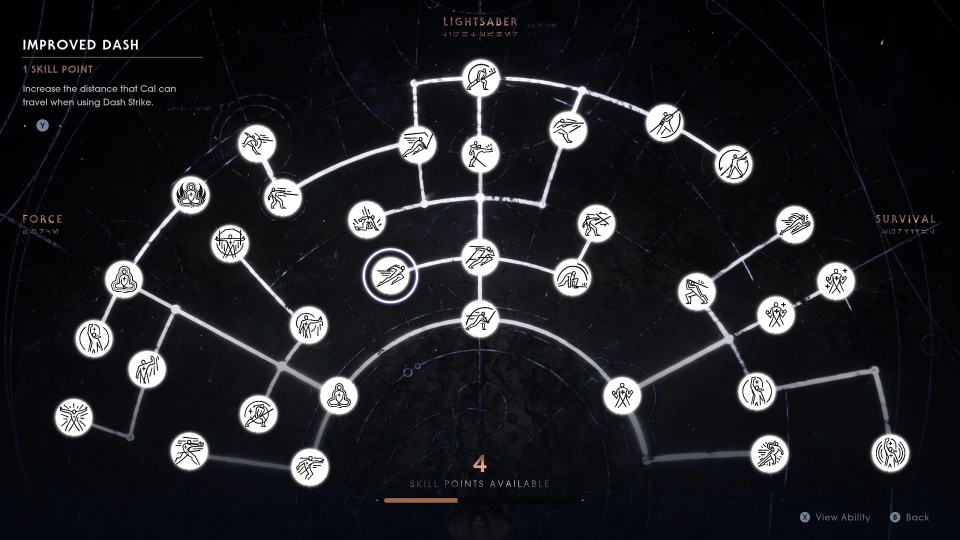 Bleiben wir also bei der Spielmechanik. Wie es bereits mehrfach angeklungen ist, bedient sich Fallen Order freizügig beim Platzhirschen Dark Souls und übernimmt viele Gameplayelemente. Neben den erwähnten Raststätten, an denen wir unsere gesammelten Skillpunkte in unterschiedliche Fähigkeiten im Bereich Force (Machtfähigkeiten), Lightsaber (Kampfmoves) und Survival (Heilung und Lebensenergie) verteilen dürfen, können wir besagte Erfahrungspunkte auch durch vorzeitiges Ableben verlieren und müssen sie wieder einsammeln. Schaffen wir das nicht, sind sie futsch. Ich habe auf dem zweiteinfachsten (oder drittschwersten, je nachdem, wie man es betrachten möchte) Schwierigkeitsgrad gespielt und das ist mir kein einziges Mal passiert. Am Ende hatte ich durch das Abgrasen der Planeten sowieso zu viele Skillpunkte zum Ausgeben – schade, Spiele wie Assassin’s Creed Odyssee lassen mich wenigstens noch punktuell Attribute steigern. Generell fand ich das Skillsystem aber gut umgesetzt und motivierend. Die Fähigkeiten sind größtenteils sinnvoll und das Vorkämpfen von Checkpoint zu Checkpoint sorgt für belohnende und kurzweilige Progression. Zudem fühlen wir uns am Ende nicht vollkommen übermächtig wie Kollege Starkiller aus The Force Unleashed, allerdings auch nicht wirklich stark. Schuld daran: das Kampfsystem.