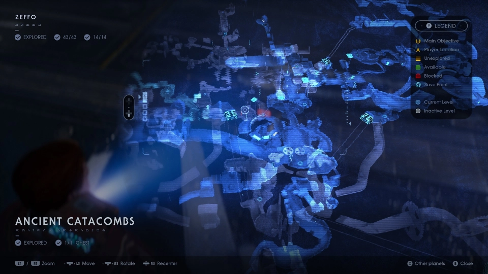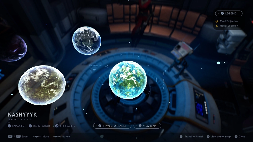 Weitere Dinge, die wir beim Entdecken finden, sind Container mit Costumizations für das Outfit unseres Protagonisten, BD-1, der Mantis (unseres Raumschiffs) und unseres Lichtschwertes. Die sind alle rein optischer Natur und eine nette Dreingabe. Das stört mich auch nicht, schließlich macht ein Lichtschwert immer gleich viel Aua, egal, welche Farbe oder was für einen Griff es hat. Wer alles finden will, muss aber gebetsmühlenhaft jede Map abgrasen oder direkt per Online-Guide suchen. Beim Entdecken der diversen Locations helfen Shortcuts, die wir beim Durchstreifen der wunderschönen, mit Liebe zum Detail gestalteten Maps finden und uns längere Levelabschnitte abkürzen lassen. Allerdings weiß hier zum einen die unübersichtliche Karte zu frustrieren, die mich ein ums andere Mal zur Weißglut getrieben hat und dem Spieler klar signalisiert: „Du kannst mich zwar benutzen, aber lern‘ am besten einfach die Laufwege auswendig.“