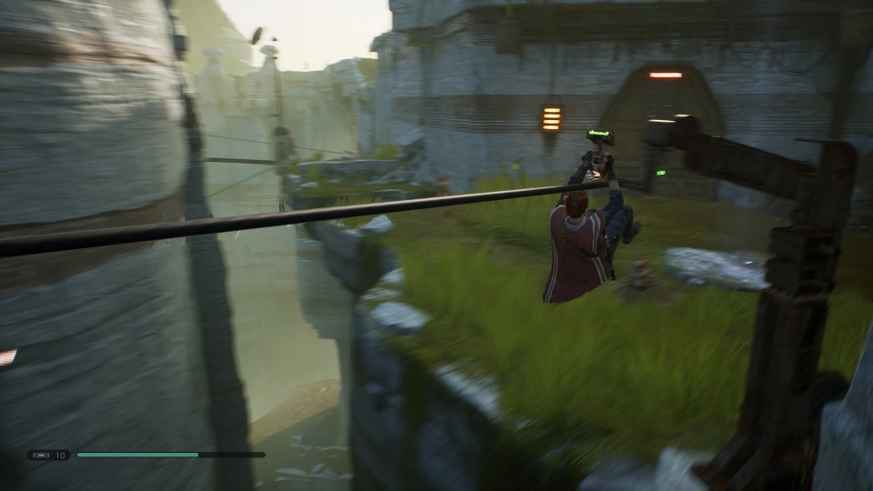 Alleine durch diesen Einstieg war ich schon on Board, hatte Bock auf das, was da noch kommen sollte. Das war zunächst das Tutorial. Das Gameplay erinnert an die Prince of Persia-Spiele und geht okay von der Hand, auch wenn ich smootheres Gameplay gewohnt war. Egal, die Atmosphäre macht gerade alles wett. Nach der obligatorischen Exposition werden wir dann gezwungen, unsere Machtfähigkeiten einzusetzen, die Inquisition kommt und tötet unseren besten Kumpel. Wir fliehen, stehen kurz davor, wahlweise einem Abgrund oder einem Lichtschwert zum Opfer zu fallen, als wir von Unbekannten per Raumschiff gerettet werden. Puh, ganz schön knapp, Rettung in letzter Sekunde… alles schon 100 Mal gesehen.