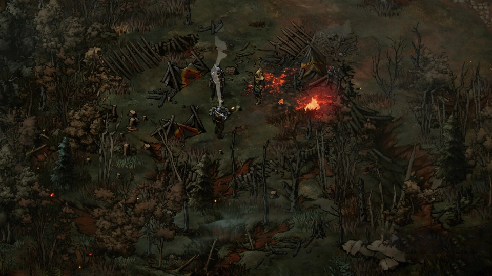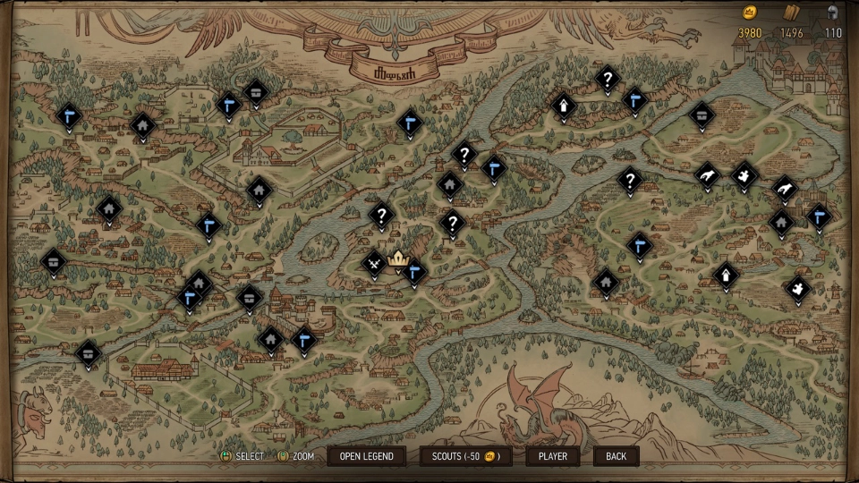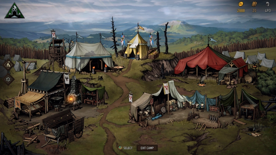 Abgesehen von den Begleitern, die allesamt interessant geschrieben sind und auch außerhalb der Kampagnenkarte im eigenen Lagern durch kurze Dialoge mehr Tiefe erhalten, werden unsere Entscheidungen durch zwei weitere Faktoren beeinflusst: die Moral unserer Soldaten sowie unsere Ressourcen. Erstere besteht aus drei Stufen: rot, gelb und grün und beeinflusst die Werte unserer Karten im Kampf – mehr dazu später. Generell werden bei Entscheidungen in der Spielwelt immer auch die Auswirkungen angezeigt. Helfen wir der alten Frau mit einer kleinen Geldspende, ihren vom Krieg zerstörten Hof zu reparieren, steigert das die Moral der Truppe, kostet uns dafür allerdings auch Gold und Holz. Das sind, neben Rekruten, die einzigen Ressourcen, die wir während unseres Feldzuges als Loot am Wegesrand oder Belohnungen für gewonnene Kämpfe und Entscheidungen erhalten können. Und die brauchen wir auch dringend, um unser Lager aufzurüsten.
