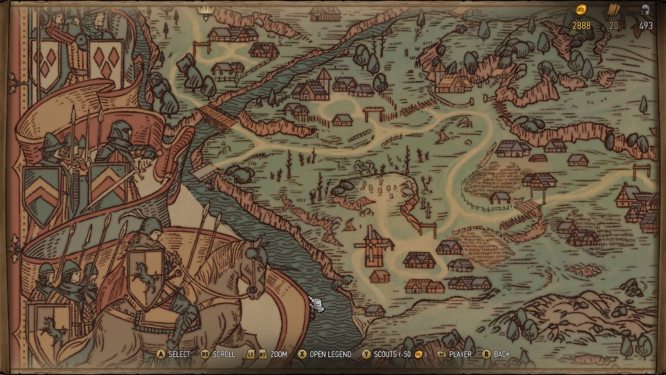 Zwar wirkt die Spielwelt auf den ersten Blick sehr weitläufig und immer wieder laden Abzweigungen zum Erkunden ein, allerdings bemerkt man auch schnell die vorgegebene Linearität, die uns Thronebreaker deutlich vorgibt. Das Umherlaufen in der Welt macht dabei Spaß und die vielen Interaktionspunkte sorgen dafür, dass das Abweichen von der Marschroute nicht langweilig wird. Unterwegs gibt es zudem auch ein paar verstecke Truhen zu finden, deren Standort wir erst mittels einer Schatzkarte in der Spielwelt ausloten müssen. Deren Inhalt ist dagegen enttäuschend, befinden sich in ihnen beim ersten Spieldurchlauf doch ausschließlich Karten und Portraitrahmen für die Onlinevariante Gwent: The Witcher Card Game. Und das ist schon einer meiner großen Kritikpunkte. Denn erst beim zweiten Durchspielen beinhalten sie Ressourcen, die man für das eigentliche Spiel bitter benötigt.