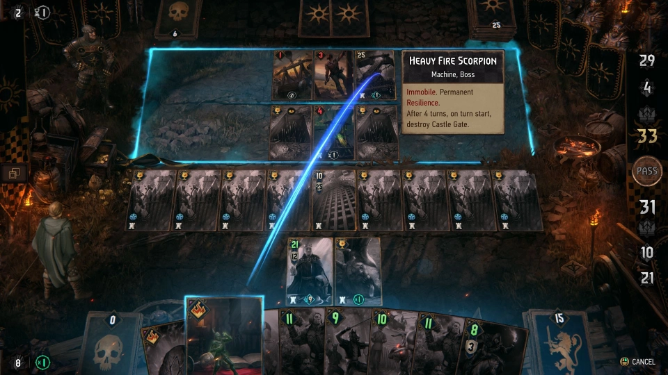 Was das Kampfsystem aber ultimativ vor dem Spielerfrust bewahrt, ist der Abwechslungsreichtum, mit dem die Entwickler jedes Aufeinandertreffen individualisiert haben. Die bekannten Best-of-Three-Spiele sind die Ausnahme, viel häufiger dauern die Kämpfe sogar nur eine Runde an. Mal besitzen wir einen fest vorgegebenen Pool an Einheiten oder erhalten Verstärkung während des Kampfes. Umgekehrt startet der Gegner häufig bereits mit einzigartigen Karten und Effekten auf dem Feld, die wir strategisch Ausschalten müssen. Beispielsweise simuliert Thronebreaker eine Belagerung, indem in der Nahkampfreie eine Mauer mitsamt Eingangstor liegt. Zwar kann der Gegner dort keine Einheiten positionieren, allerdings werden seine Karten in jeder Runde verstärkt.